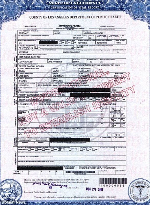 2009 Acte de décès (Los Angeles, Californie, USA)