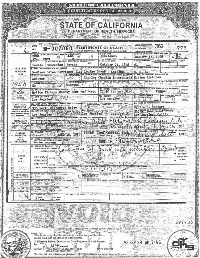 1958 Acte de décès (Los Angeles, Californie, USA)