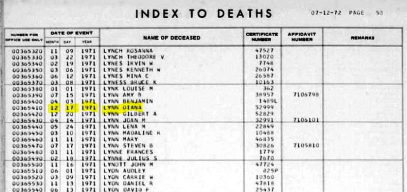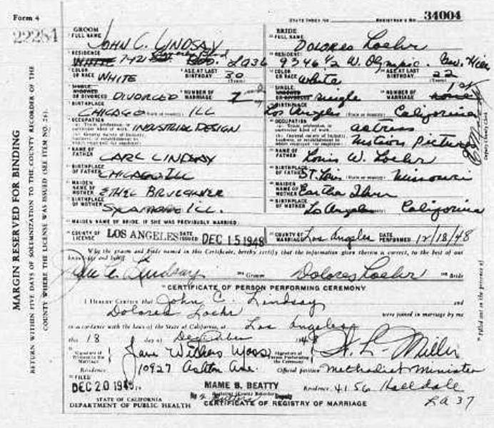 1926 Retranscription de l’acte de naissance (Los Angeles, Californie, USA) |  1930 Acte de recensement (Los Angeles, Californie, USA) |  1948 Acte de mariage avec John C. Lindsay (Los Angeles, Californie, USA) |  1971 Index des décès (Los Angeles, Californie, USA) |