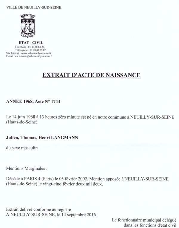 1968 Acte de naissance (Neuilly-sur-Seine, France)