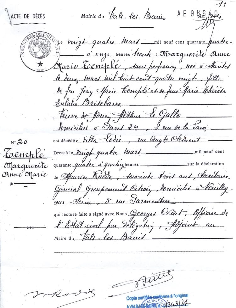 1944 Acte de décès (Vals-les-Bains, France)