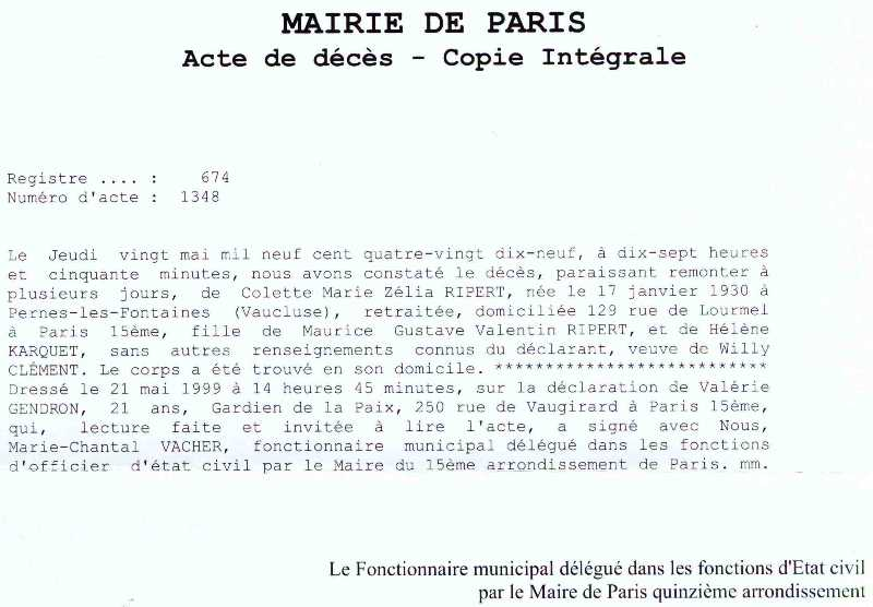 1999 Acte de décès (Paris 15ème, France)