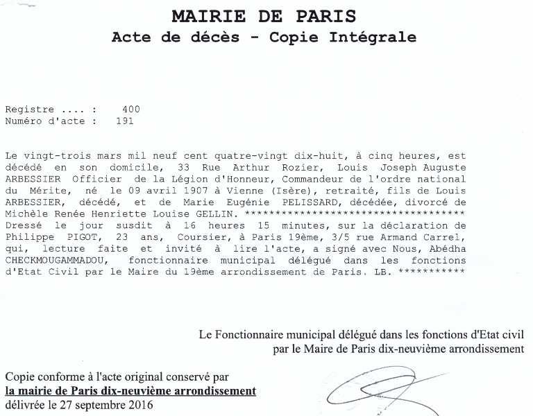 1998 Acte de décès (Paris 19ème, France)