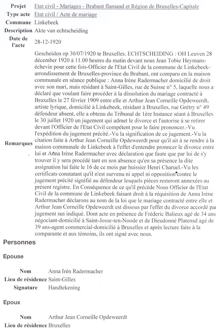 1920 Certificat de divorce (Linkebeek, Belgique)