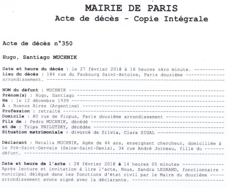 2018 Acte de décès (Paris 12ème, France)