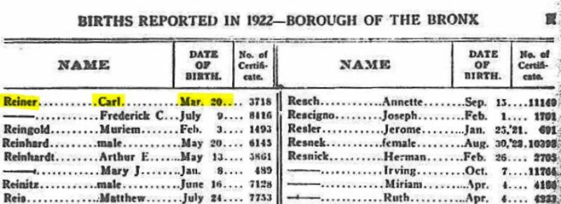 1922 Registre des naissances (Le Bronx, New York, USA)