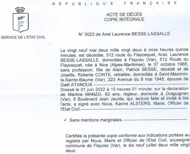 2022 Acte de décès (Flayosc, France)