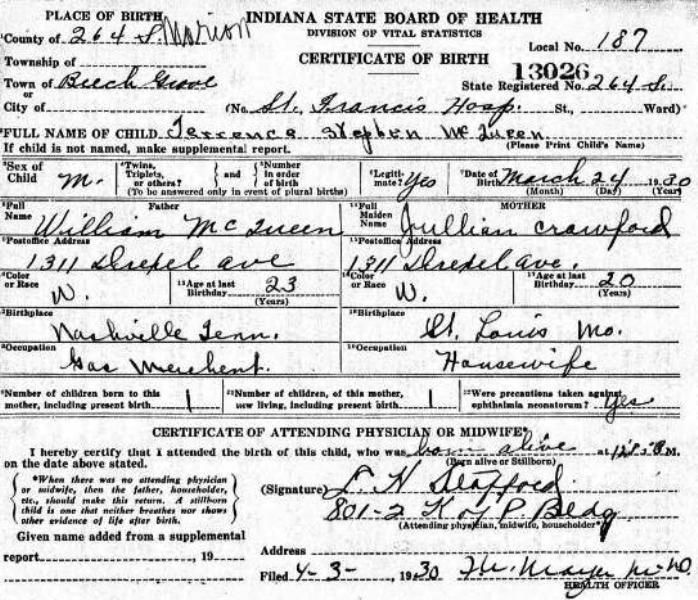 1930 Acte de naissance (Beech Grove, Indiana, USA)