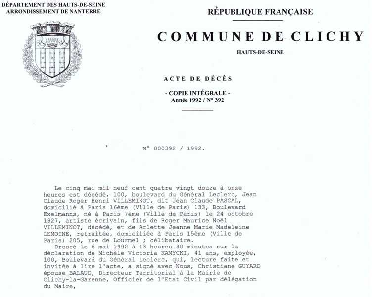 1992 Acte de décès (Clichy-la-Garenne, France)