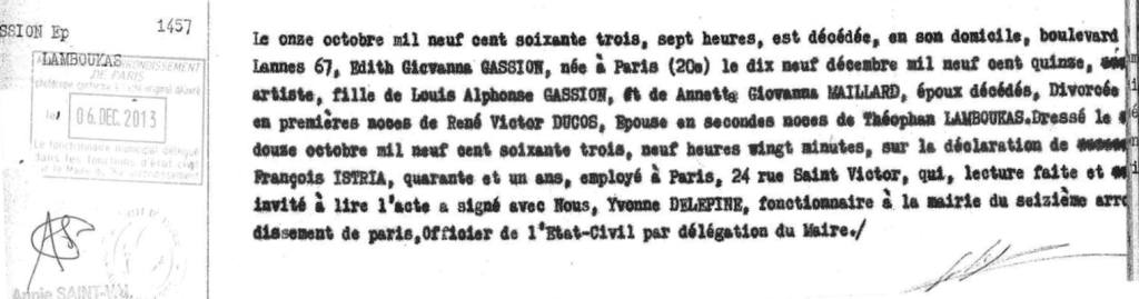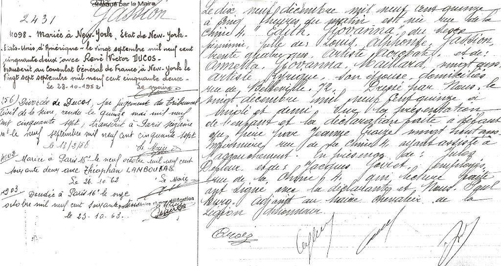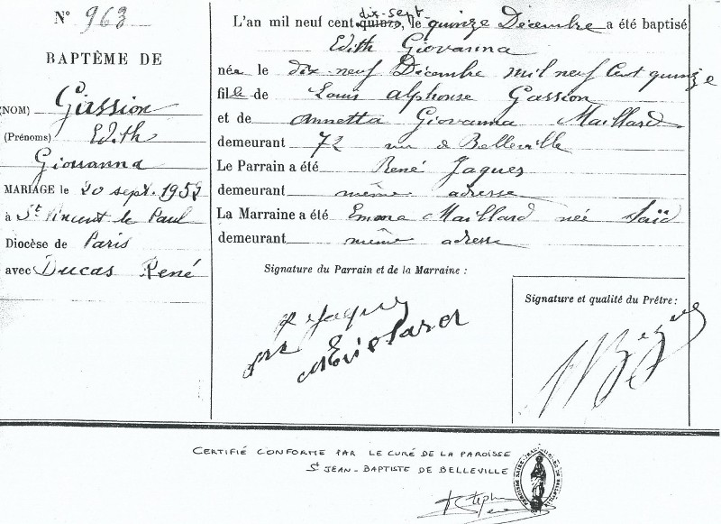 ![]() 1915 Acte de naissance (Paris 20ème, France) | ![]() 1917 Acte de baptême (Paris 19ème, France) | ![]() 1962 Acte de mariage (Paris 16ème, France) | ![]() 1963 Acte officiel de décès (Paris 16ème, France) | ||
