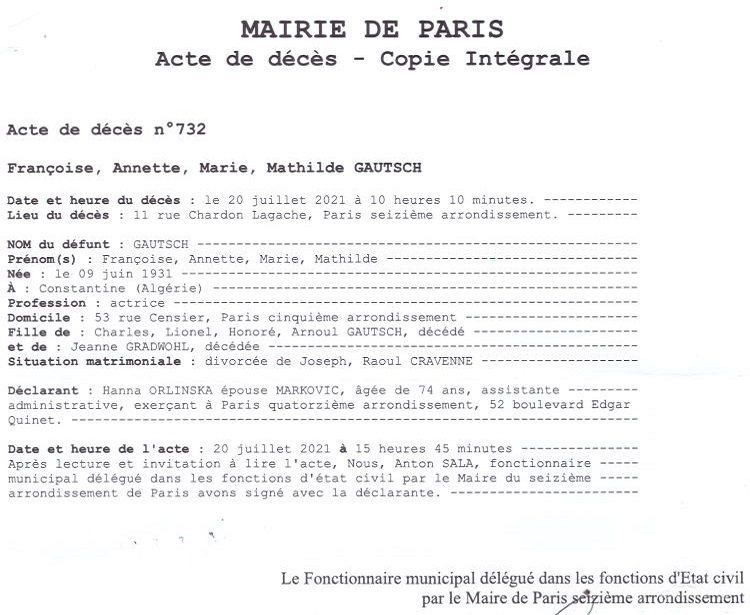 2021 Acte de décès (Paris 16ème, France)