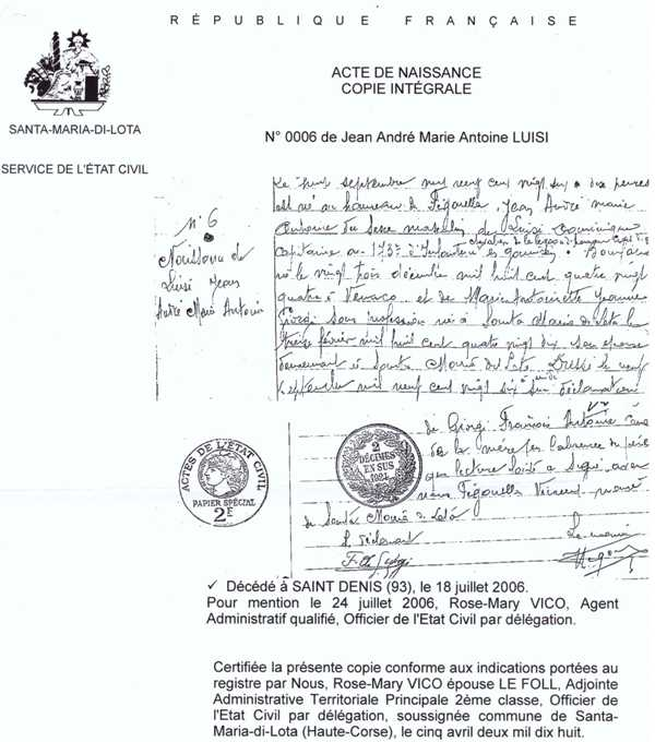 1926 Acte de naissance (Santa-Maria-di-Lota, France)
