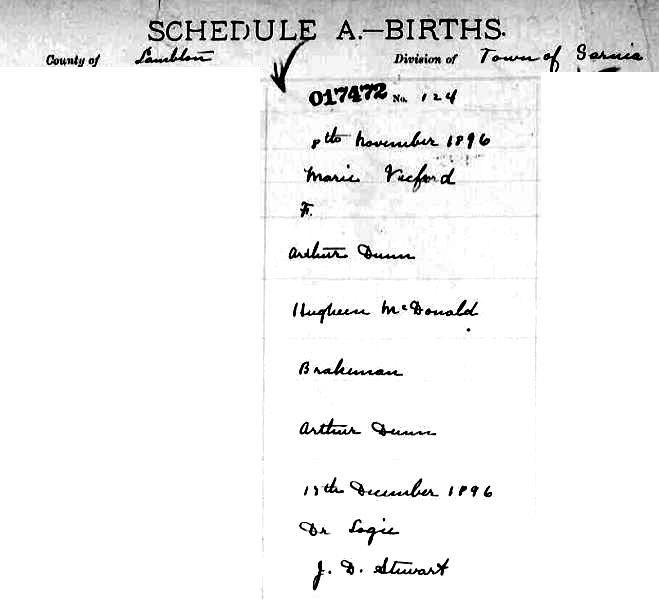 1896 Acte de naissance (Sarnia, Ontario, Canada)