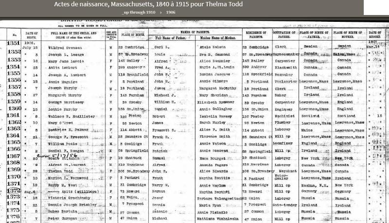 1906 Acte de naissance ligne 1369 (Lawrence, Massachusetts, USA)