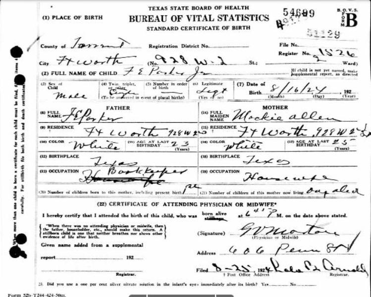 1924 Acte de naissance (Fort Worth, Texas, USA)