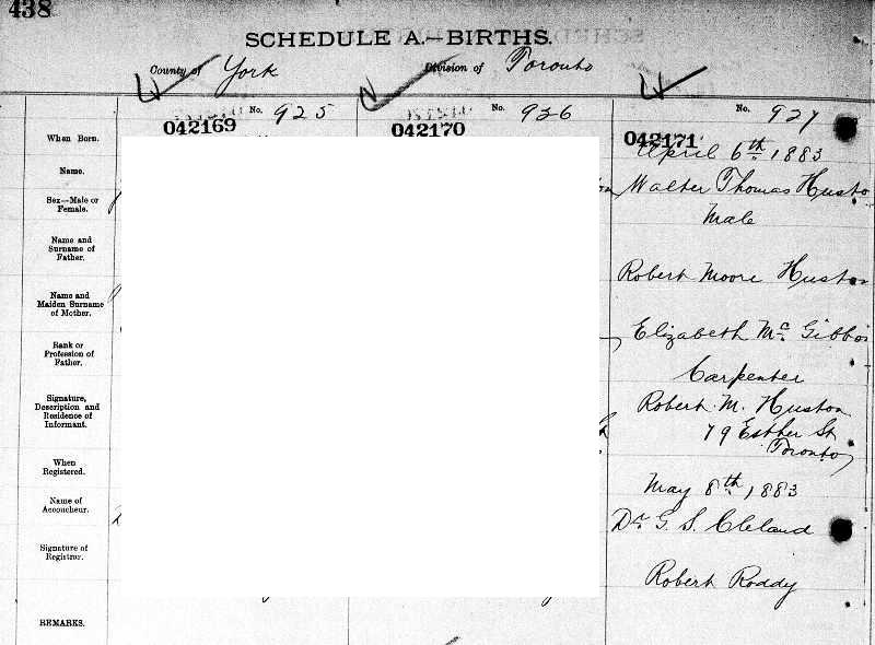 1883 Acte de naissance (Toronto, Ontario, Canada)