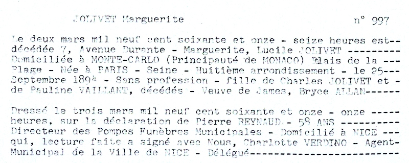 1971 Acte de décès (Nice, France) Information erronée concernant la naissance.