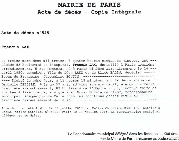 2013 Acte de décès (Paris 13ème, France)