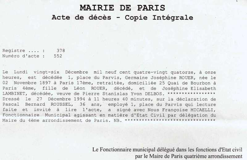 1994 Acte de décès (Paris 4ème, France)