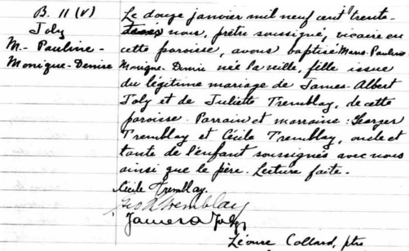 1933 Acte de baptême (Jonquière, Québec, Canada)