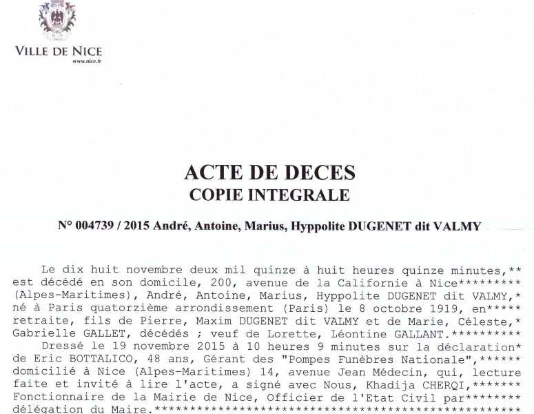 2015 Acte de décès (Nice, France)