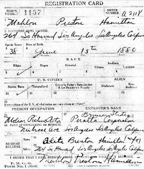 1917 Fiche de conscription (Los Angeles, Californie, USA)
