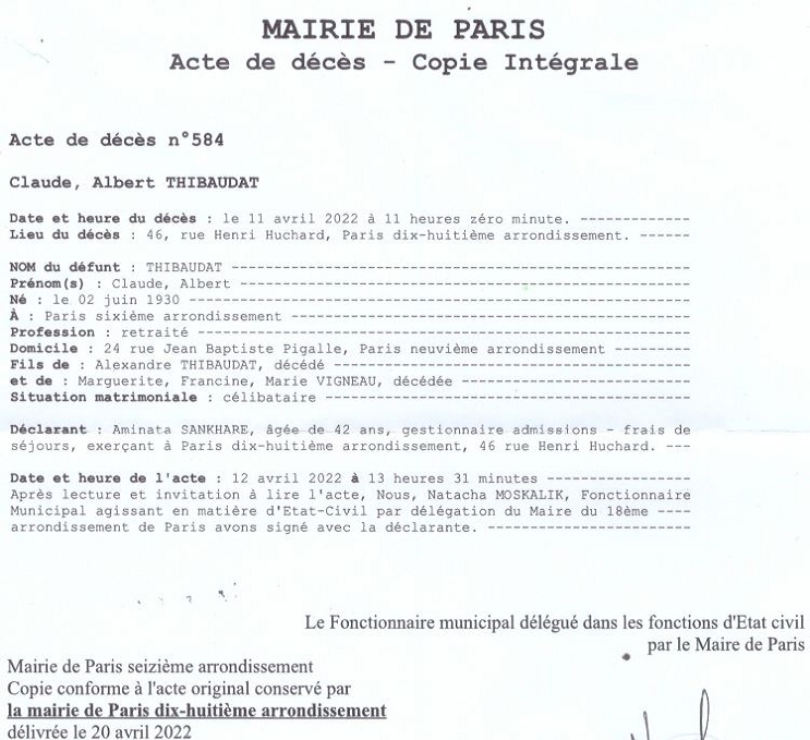 2022 Acte de décès (Paris 18ème, France)