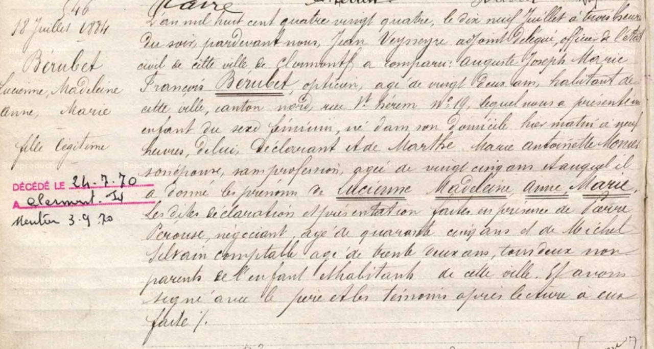 1884 Acte de naissance (Clermont-Ferrand, France)