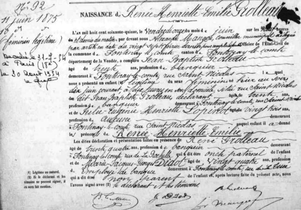 1875 Acte de naissance (Fontenay-le-Comte, France)
