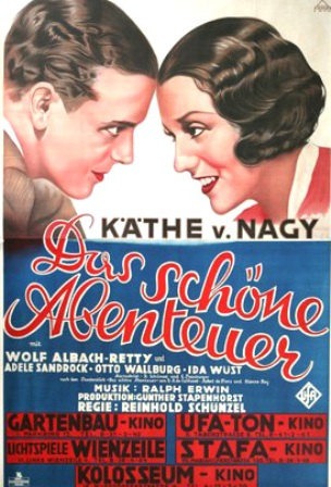 ![]() 1932 La belle aventure (das schöne abenteuer) de Reinhold Schünzel avec Käthe von Nagy & Wolf Albach-Retty | ![]() 1933 Chérie j’attends ton arrivée (kind, ich freu’ mich auf dein kommen) de Kurt Gerron avec Magda Schneider | ![]() 1940 Sept années de poisse (sieben jahre pech) de Ernst Marischka avec Hans Moser & Wolf Albach-Retty | ![]() 1953 Tante Jutta de Calcutta (tante Jutta aus Kalkutta) de Karl Georg Külb avec Viktor Staal & Gunther Philipp | ||