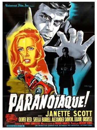 ![]() 1955 L’ennemi invisible (passport to treason) de Robert S. Baker avec Rod Cameron, Neil Wilson & Lois Maxwell | ![]() 1963 Paranoïaque (paranoiac) de Freddie Francis avec Janette Scott, Maurice Denham, Oliver Reed & Sheila Burrell | ![]() 1965 Hystérie (hysteria) de Freddie Francis avec Robert Webber, Anthony Newlands, Sue Lloyd & John Arnatt | ![]() 1973 Le cerveau de la terreur (vault of horror) de Roy Ward Baker avec Glynis Johns & John Forbes-Robertson | ||