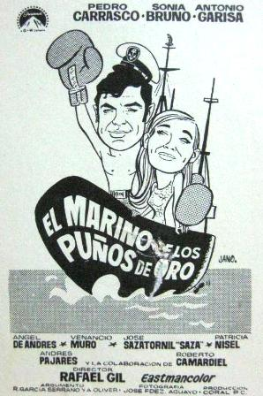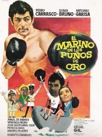 Malgré son faible gabarit, Pedro Carrasco devient vite un excellent boxeur et part avec son club pour l’Europe (Italie, Espagne). Mais Pedro, qui a toujours voulu garder sa nationalité espagnole, doit faire son service militaire qui dure à l’époque près de deux ans. Il est incorporé dans la marine mais peut bénéficier de conditions particulières pour s’entraîner et participer à des rencontres de boxe. Installé définitivement en Espagne, il devient le 30 juin 1967, champion d’Europe des poids légers en battant à Madrid le Danois Boerge Krogh. Parce qu’il a été, à l’occasion d’une victoire, acclamé par ses camarades qui, dans leur enthousiasme, ont lancé leurs bonnets sur le ring, le jeune boxeur est surnommé par les journalistes «Le marin aux poings d’or». L’idée germe alors dans l’esprit des producteurs de cinéma de réaliser un film du même nom. C’est Rafael Gil qui est chargé de mettre en scène l’incroyable aventure de cet Andalou parti faire fortune au Brésil. Pedro se fait acteur pour interpréter un certain Pedro Montero, incorporé chez les fusiliers marins, et qui après bien des péripéties devient un champion. Le boxeur, sans parler des scènes de combat, se sort bien de l’épreuve, et même s’il a la parole rare, il joue avec naturel et gentillesse, entouré de seconds rôles épatants comme Ángel de Andrés, un vieux boxeur à l’élocution difficile et la mémoire défaillante pour avoir reçu trop de coups, ou Antonio Garisa, un impresario farfelu. Sonia Bruno, interprète la méchante qui veut empêcher notre gentil marin boxeur de s’entraîner pour faire gagner son adversaire! Le film, à sa sortie en octobre 1968, dépasse le million d’entrées.