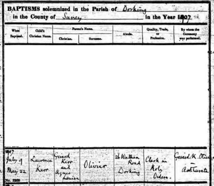 1907 Acte de baptême (Dorking, Royaume-Uni)