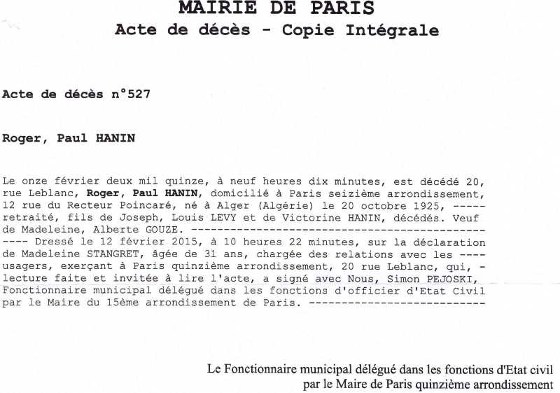 2015 Acte de décès (Paris 15ème, France)