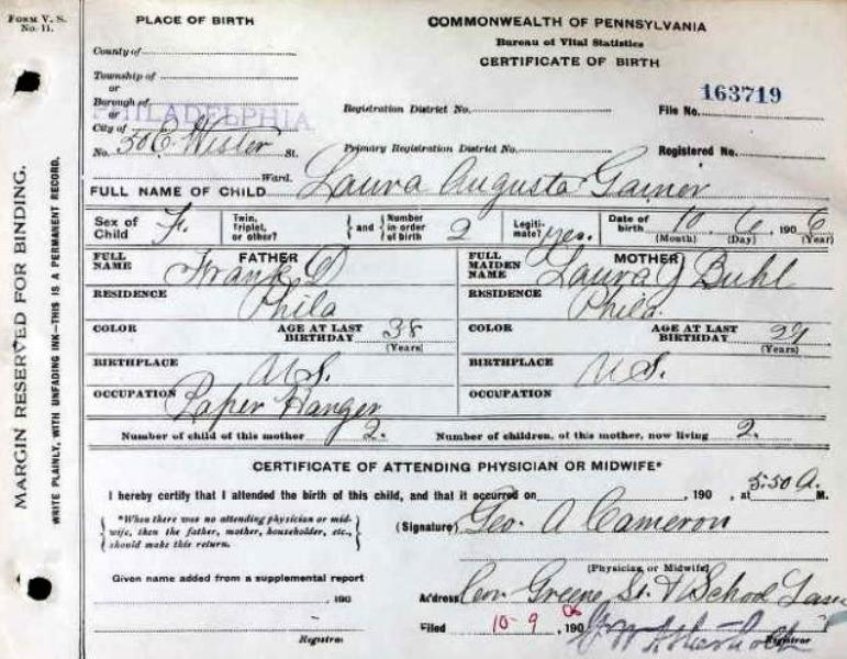 1906 Acte de naissance (Philadelphie, Pennsylvanie, USA)