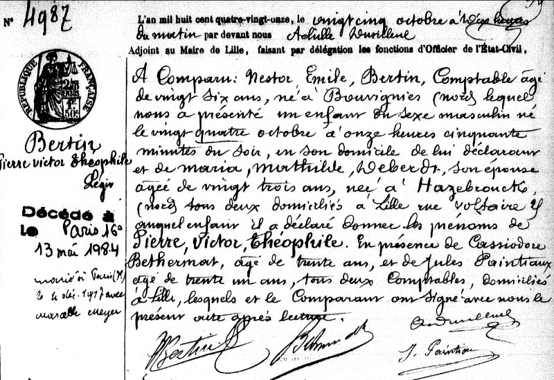 1891 Acte de naissance (Lille, France)