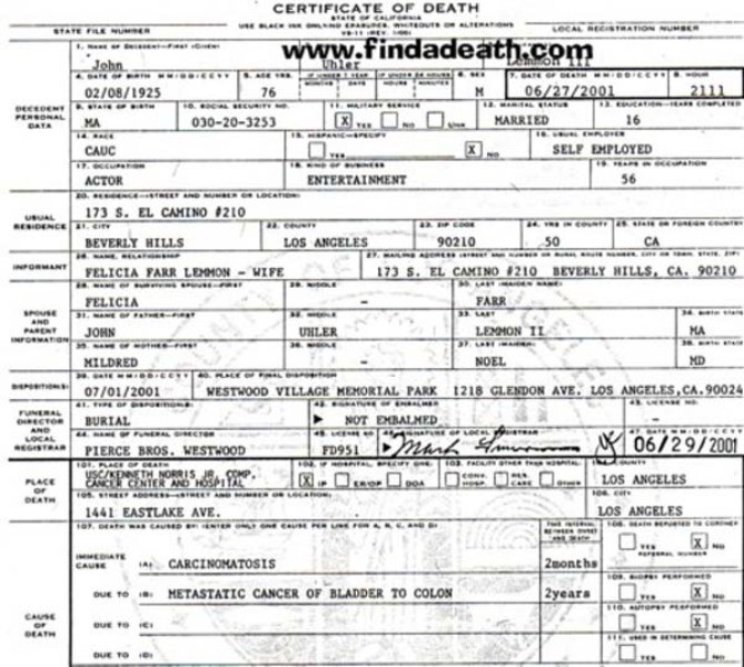 2001 Acte de décès (Los Angeles, Californie, USA)