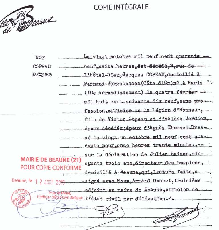 1949 Acte de décès (Beaune, France)