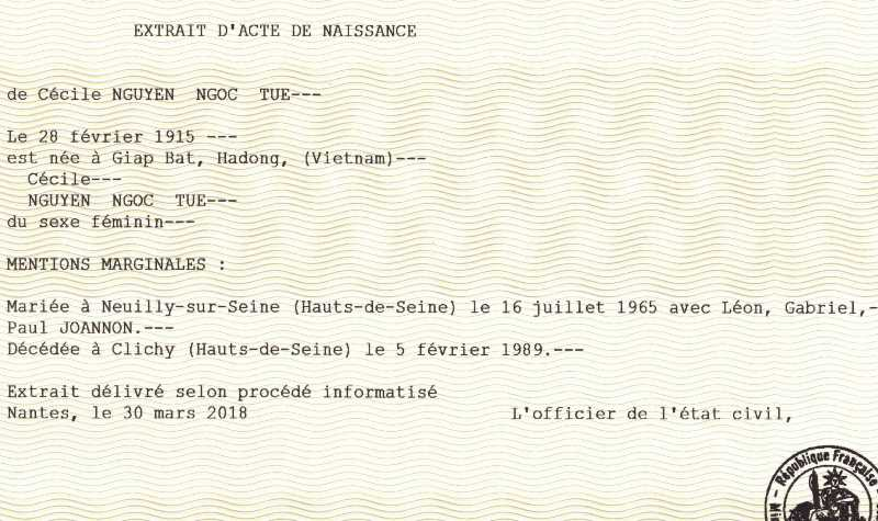 1915 Acte de naissance (Giap Bat, Tonkin, Indochine Française)