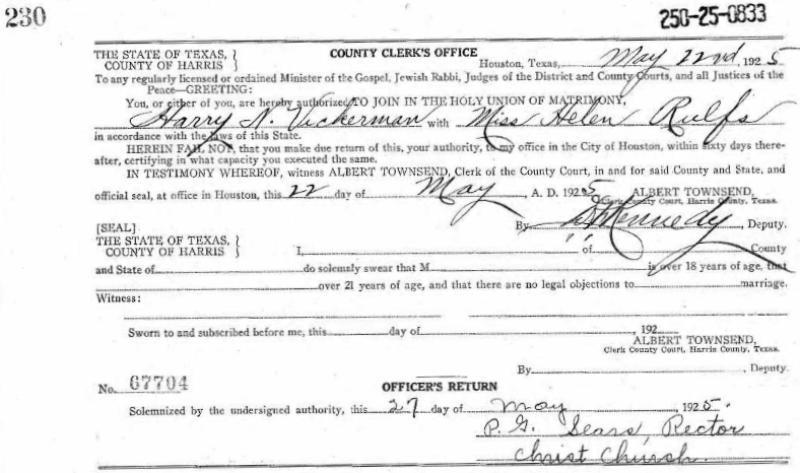 1925 Acte de mariage avec Harry Vickerman (Harris, Texas, USA)