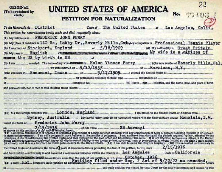 1935 Document de naturalisation de Frederick Perry avec date de naissance de