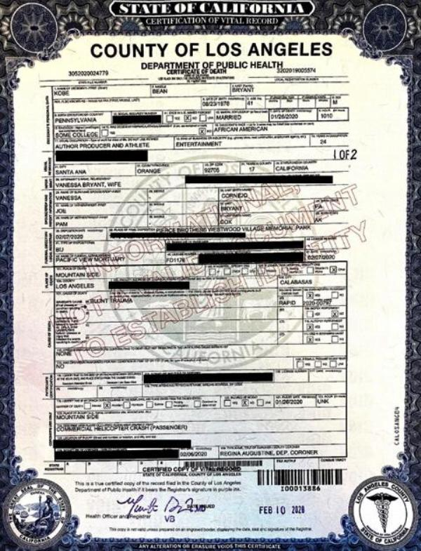 2020 Acte de décès (Calabasas, Californie, USA)