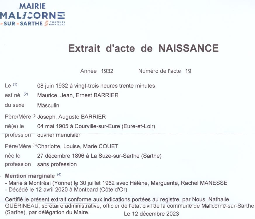 1932 Acte de naissance (Malicorne-sur-Sarthe, France)