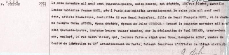 1944 Acte de décès (Paris 15ème, France)