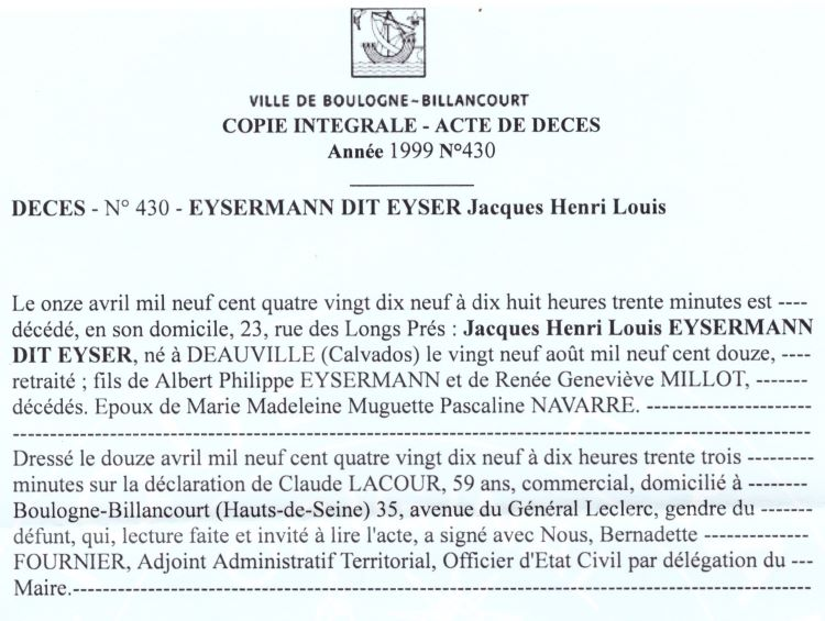 1999 Acte de décès (Boulogne-Billancourt, France)