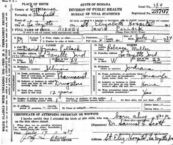 1934 Acte de naissance (Lafayette, Indiana, USA)