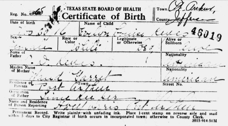 1916 Acte de naissance (Port Arthur, Texas, USA)