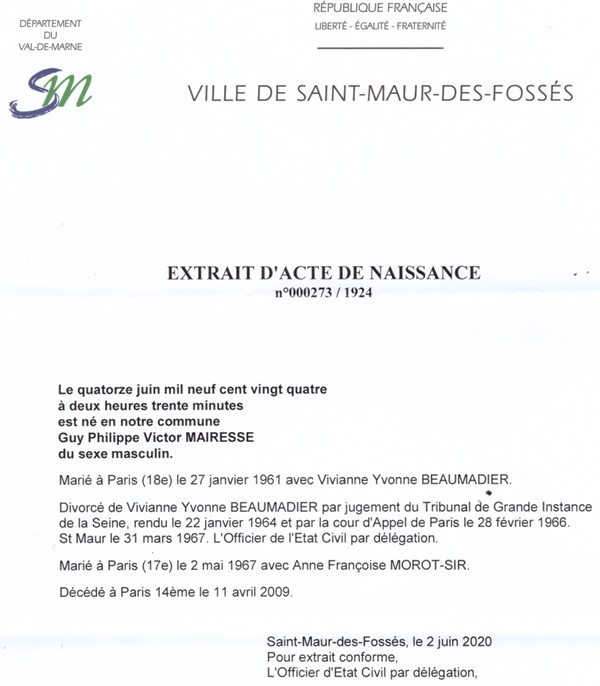 14 juin 1924 Acte de Naissance (Saint-Maur-des-Fossés, France)