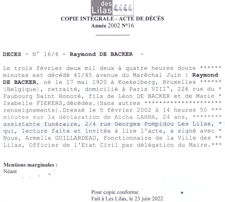 2002 Acte de décès (Les Lilas, France)