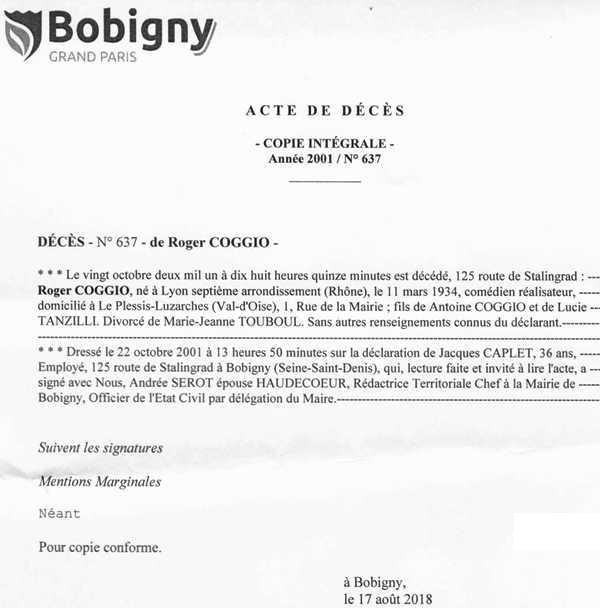 2001 Acte de décès (Bobigny, France)